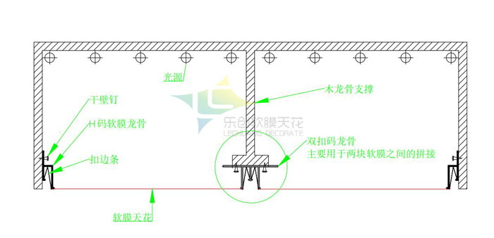 軟膜天花可以大面積安裝,最寬可以做5米不拼接,但由于其材料本身的柔韌性,存在一定的下垂,所以大面積安裝我們一般建議分塊安裝,下面給大家介紹一下分塊安裝的具體結構。 大面積軟膜分塊安裝,根據客戶的實際需求,我們一般建議分塊在2米左右寬度的,這樣能有效的避免下垂,那具體如何分塊呢?往下看,如下圖所示,四周正常固定專用的h龍骨,中間采用專用的雙扣龍骨進行分割,中間支撐桿可以采用木龍骨或者其他材料都可以,需要注意的是支撐桿的高度要比四周高大約2.5公分,這個是為了方便雙扣龍骨安裝在下部位置以后和四周h龍骨齊平。